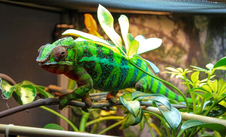 Il camaleonte, richiede condizioni specifiche di illuminazione e riscaldamento per rimanere in buona salute.