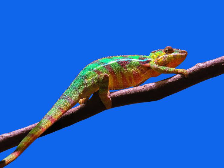 Il camaleonte, appartiene allo stesso sottordine delle lucertole ossia i sauri e in effetti l’aspetto lo ricorda molto. È un rettile squamato diurno originario dell’Africa, presente in più di 200 specie e la maggior parte vengono da dal Madagascar. Le misure di questo rettile variano dai 3 ai 60 cm di lunghezza a seconda della specie e un peso che per forza di cose oscilla dai 50 ai 150gr.