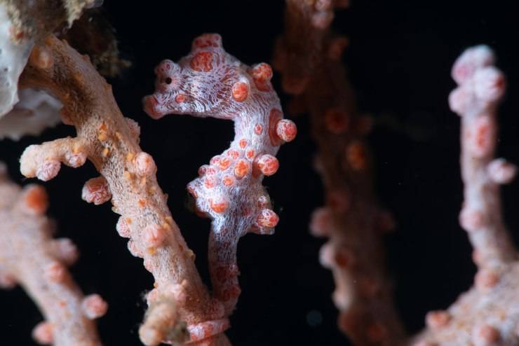 Il suo corpo è privo di denti e di stomaco e ciò che rende possibile l’alimentazione di questo animale è l’utilizzo del muso con cui aspira le sue prede. Il cavalluccio pigmeo in particolare è praticamente identico ai coralli nei quali si nasconde ha sviluppato questo look specifico per un determinato ambiente.
