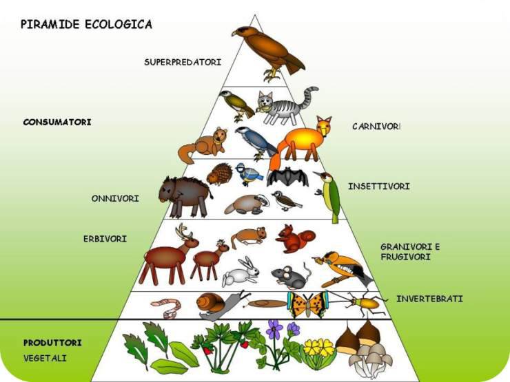 Ma se alla base della piramide ci sono le piante che si trasformano in cibo ‘offerto’, chi sono i consumatori? Ne distinguiamo di tre tipi: i primari sono gli animali che si cibano direttamente delle piante, i secondari (o meso-predatori) sono quelli che mangiano i primari o erbivori; infine vi sono i terziari (o super-predatori) che si alimentano sia dei primi sia dei secondi.