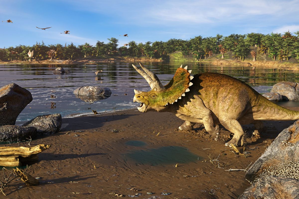 Il suo nome significa appunto “faccia a tre corna” e descrive alla perfezione la caratteristica fisica tipica dell’aspetto di questi dinosauri erbivori. Vissuti in Nord America nel tardo Cretaceo, tra i 68 e i 66 milioni di anni fa, è stato una delle prede preferite del Tyrannosaurus Rex. Il Triceratops misurava tra i 7 e 10 metri di lunghezza, era alto tra i 3,5 e i 4 metri e pesava tra le 5 e le 10 tonnellate.