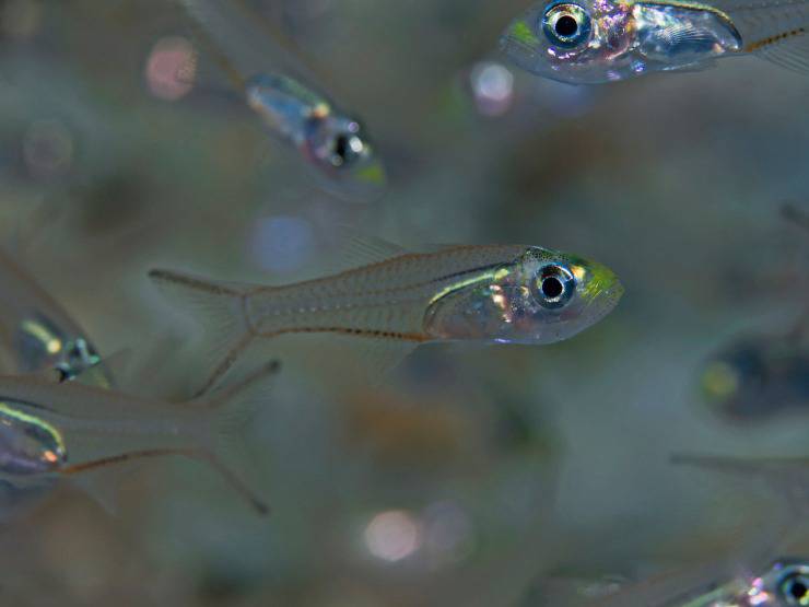 La caratteristica è la colorazione che è praticamente assente, questa trasparenza del corpo lascia intravedere lo scheletro. Non sempre sono presenti delle sfumature che colorano il corpo di colore argento o gialle.