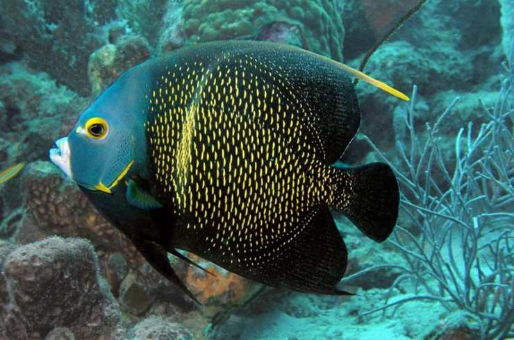 Questo bellissimo pesce è originario delle scogliere poco profonde delle Bahamas, della Florida e dei Caraibi. Il pesce angelo francese (Pomacanthus paru) è abbastanza diverso da giovane, e ha strisce verticali che scorrono lungo il suo corpo. Man mano che matura, le strisce scompaiono e lasciano un corpo di colore grigio / nero intenso con scaglie di giallo.