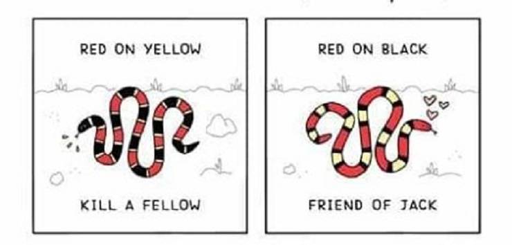“Red on Black, friend of Jack” (letteralmente “Rosso su nero, amico di Jack” se la striscia rossa è vicina a quella nera l’animale non è pericoloso) e “Red on Yellow, kill a fellow” (letteralmente “Rosso su giallo, uccidi un compagno“; se la striscia rossa è vicina a quella gialla allora si tratta di un esemplare velenoso).