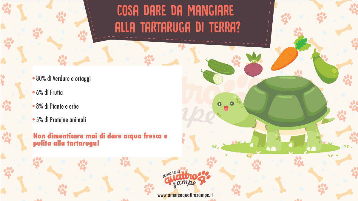 Studi hanno confermato che il funzionamento dell’apparato digestivo delle tartarughe di terra è simile a quello di altre specie erbivore ma di dimensioni assolutamente differenti, come ad esempio bovini e cavalli. La testuggine, ovvero le tartarughe delle nostre zone diverse dalle tartarughe d’acqua dolce, devono assumere per il 90% vegetali misti uniti a frutta ed ortaggi. La loro dieta in sostanza dovrà essere molto ricca di fibre, sali minerali, vitamine, acqua e poche proteine, pochi grassi e oli. Gli esemplari onnivori possono includere nella loro dieta anche le proteine animali, ma solo occasionalmente, come lumache, chiocciole, insetti, larve e molluschi.