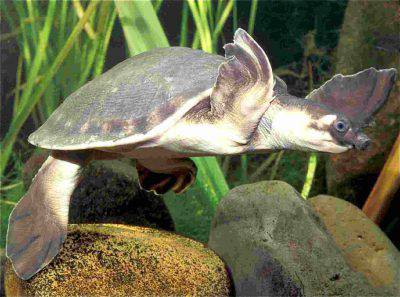Il cosiddetto ‘naso di porcello o muso di porco’ caratterizza questa tartaruga della Nuova Guinea e Australia. La tipologia di muso consente loro di respirare sott’acqua. Raggiunge dimensioni notevoli se si pensa che la lunghezza varia dai 70 ai 75 cm e il peso raggiunge anche i 25 kg. Ha un aspetto esteriore che la differenzia notevolmente dagli esemplari sopra-descritti: ha arti larghi e pinniformi, con unghie relativamente corte e il suo carapace non è duro. Infatti la loro particolarità consiste nella pelle morbida che le ricopre. Sono predatori e si cibano volentieri di prede che si trovano in acqua come pesciolini, ma anche chiocciole, frutti e foglie di Ficus.