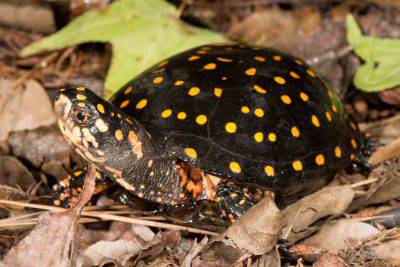Si tratta di una tartaruga semi-acquatica che mantiene dimensioni piccole che oscillano dagli 8 ai 15 cm. Prende il nome grazie alla parte superiore che le ricopre: è nera o blu scuro ma è caratterizzata da puntini rotondi e gialli. Queste macchie ricoprono anche la testa, il collo e gli arti- la forma del piastrone specifica il sesso e anche la colorazione del mento e degli occhi: il maschio infatti ha mento abbronzato, occhi marroni e coda lunga e spessa. Le femmine invece hanno il mento giallo, occhi arancioni e coda più corta del maschio; inoltre hanno una quantità di macchie gialle superiori rispetto agli esemplari dell’altro sesso. Per adottarne una è necessario informarsi che non sia frutto di traffici illegali e, dopo essere certo della provenienza, bisognerà avvertire le autorità competenti della sua detenzione.
