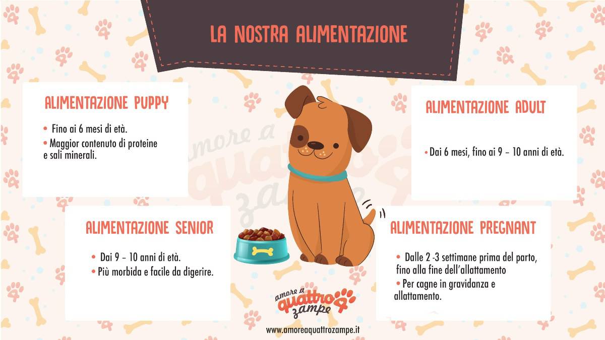 Dal punto di vista nutrizionale ma anche tecnico, possiamo dividere in quattro fasi l’alimentazione del cane e relativi tipi di dieta: