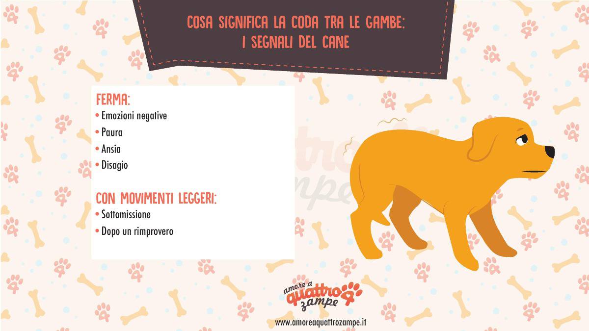 Osservando i nostri fedeli compagni a 4zampe, si notano delle leggere differenze nei loro movimenti. Così vale nel caso in cui mettono la coda tra le gambe. Ci sono dei casi in cui la coda è immobile e casi in cui scodinzolano leggermente, con la punta della coda sotto alle gambe. Quando la coda è ferma e tra le gambe signficia che il cane sta provando un’emozione negativa che può spaziare dalla paura, all’ansia fino ad un sentimento di disagio. In quel caso, il proprietario accorto deve capire la causa, richiamando inanzittutto il cane se è distante e allontanarlo dal fattore scatenante.