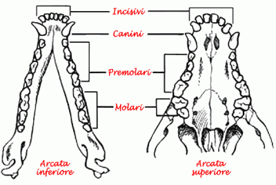 La dentatura del cane è formata da due arcate, una inferiore e una superiore, in cui i denti sono infissi uno accanto all’altro. Di apparenza ossea , sono durissimi e rappresentano gli organi passivi della masticazione.