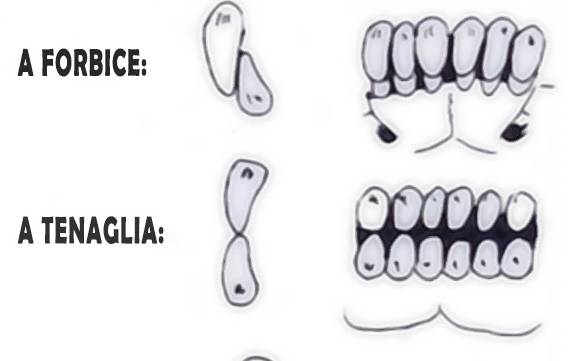 Chiusura a forbice: gli incisivi superiori sormontano esternamente quelli inferiori. In tal caso la parete interna degli incisivi superiori deve essere a stretto contatto con la parete esterna degli incisivi inferiori.