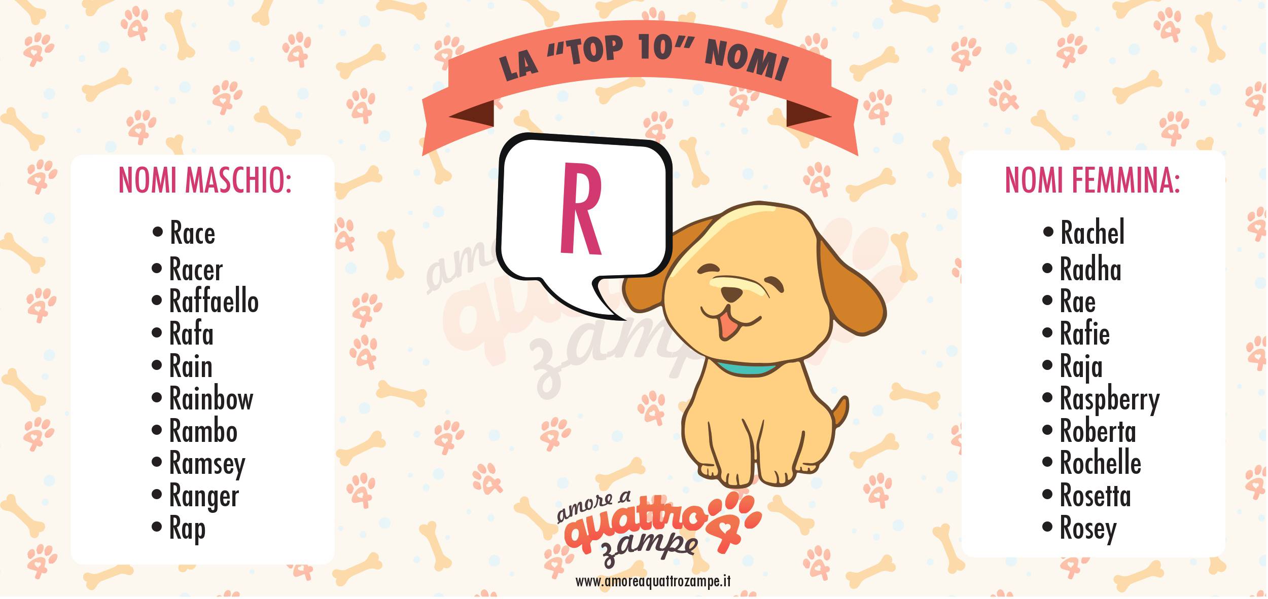 Cerchi nomi di cani femmine e maschi con la R? Da “Ricco” a “Rosey” passando per “Robbie” e “Reagan” in questa lista di oltre 150 proposte troverai quello che più ti piace.