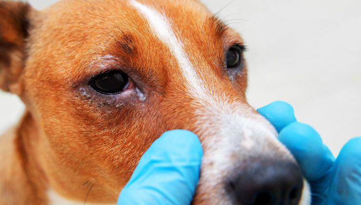 - chiusura parziale completa dell’occhio: il cane tende a chiudere l’occhio colpito per alleviare il disagio;