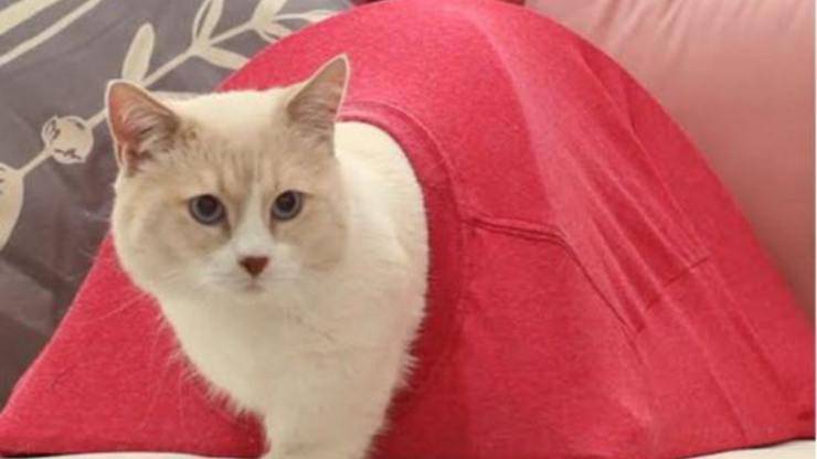 Dopodiché posizionate la maglia, abbastanza grande, sull’arco finale creato facendo in modo che la scollatura possa trovarsi al centro della parte frontale, così potrà essere usata dal gatto come porta per entrare nella cuccia.