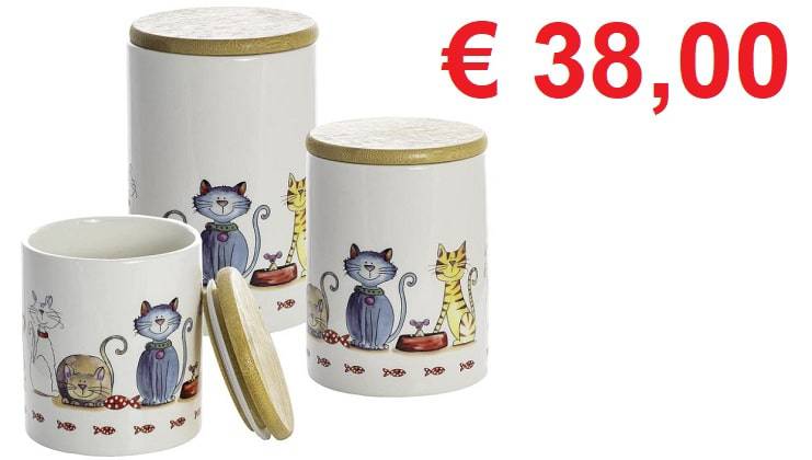 7 – Set di 3 barattoli da cucina in ceramica con coperchio in legno a tema gatti per sale, zucchero, caffè. Se volete arricchire il regalo potete aggiungere un set di strofinacci, oppure grembiule e guanto da cucina. Il costo dei barattoli è di 38 euro.