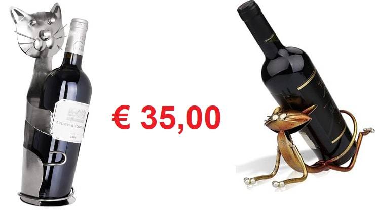 6 – Spostiamoci in cucina per il portabottiglie a tema gatto. Nella foto vedete due esempi di sculture in metallo; il gatto “abbraccia” e sostiene la bottiglia oppure porta la bottiglia in spalla. Carino vero? Prezzi a partire da 35 euro.