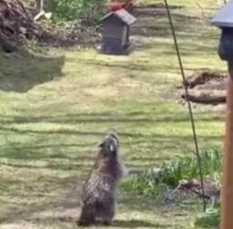 Il simpaticissimo video mostra un procione alle prese con un palo alla cui estremità è posta una casetta, dove viene conservato del mangime per uccelli. La strategia è molto semplice: arrampicarsi sull’asta per raggiungere la casetta e rubare il cibo.