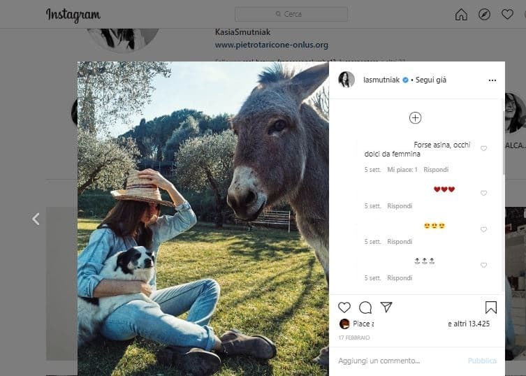 Non è la prima volta, infine, che l’attrice polacca manifesta pubblicamente il suo amore per gli animali. Sono diversi i post sui social che la vedono insieme agli amici pelosi. Si tratta soprattutto cani, ma come dimostra la foto in questo articolo c’è anche un asino!