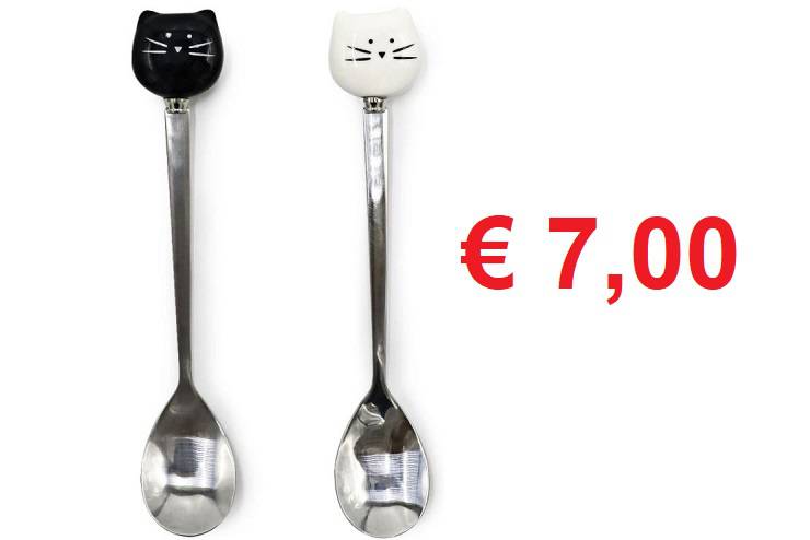3 – Cucchiaini gattini – Rimaniamo in cucina con un set di due cucchiaini in acciaio e ceramica. Perfetti per thè, caffè, dessert. Costo 7 euro.
