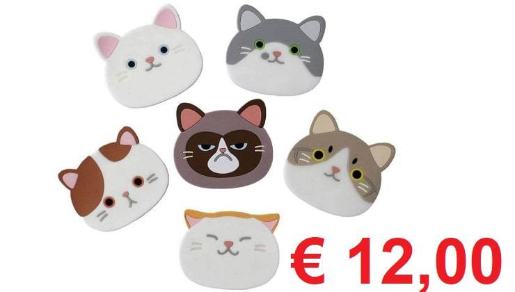 7 – Sottobicchieri – Set di 6 sottobicchieri carini in silicone con diverse facce di gatto. Perfetti per tazze da thè, bicchieri di vino o di birra. Costo 12 euro.