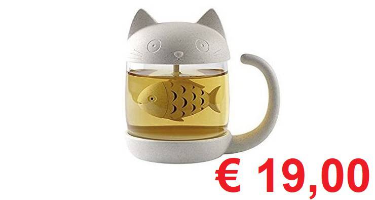 2 – Tazza gatto-pesce – Questa non è solo una tazza ma anche una bella decorazione per la cucina. Il gatto ha mangiato un pesce e ora quel pesce si trova nella pancia di Micio. Inoltre la coda del gatto è la maniglia della tazza per evitare scottature. Il pesce in realtà è il filtro e al suo interno può essere messo il thè oppure lo zucchero. Costo 19 euro.