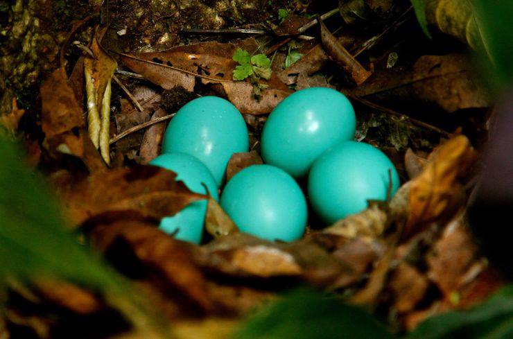 Anche se un tinamo gigante è marrone scuro, le sue uova sono lucide e colorate. È strano: è infatti un uccello che nidifica in terra, e normalmente questo tipo di uccelli mimetizzano le loro uova.