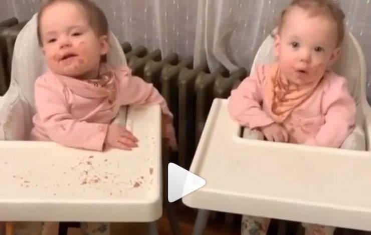 due innocenti bimbi seduti su due seggioloni, vestiti uguali, ma con una differenza: uno di loro, nascosto sotto il suo seggiolone, ha un adorabile Golden Retriever. Il bimbo, fortunato dal nostro punto di vista, quando allunga e muove i suoi teneri piedini, entra in contatto con una superficie morbida e pelosa.