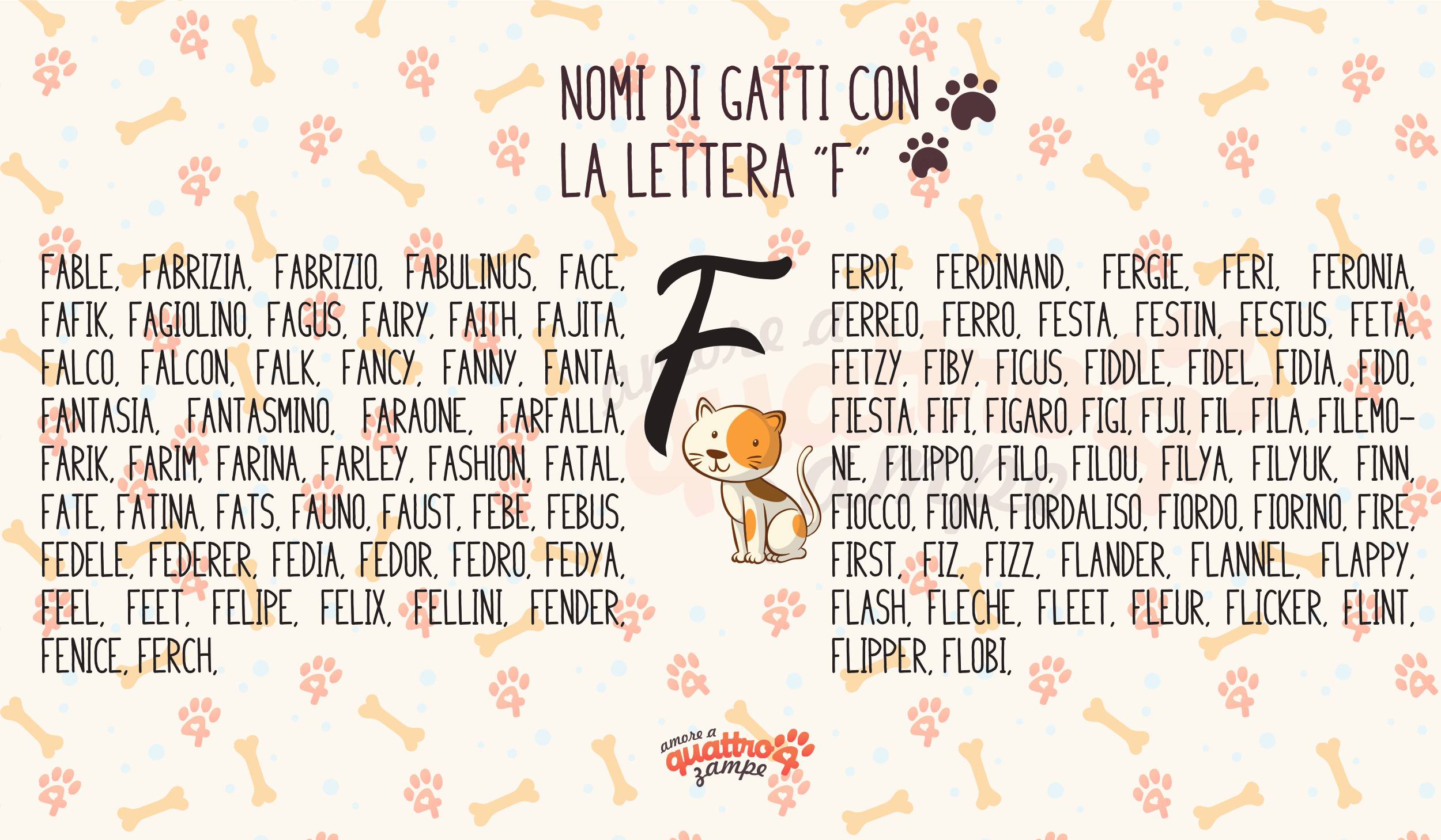 Sei alla ricerca del nome perfetto per Micio? Vuoi che questo inizi con una lettera specifica dell’alfabeto? Se stai cercando uno con la effe sei capitato nel posto giusto. In quest’articolo abbiamo raccolto una serie di suggerimenti che ti consentiranno di scegliere i nome più adatto al tuo amico a quattro zampe.