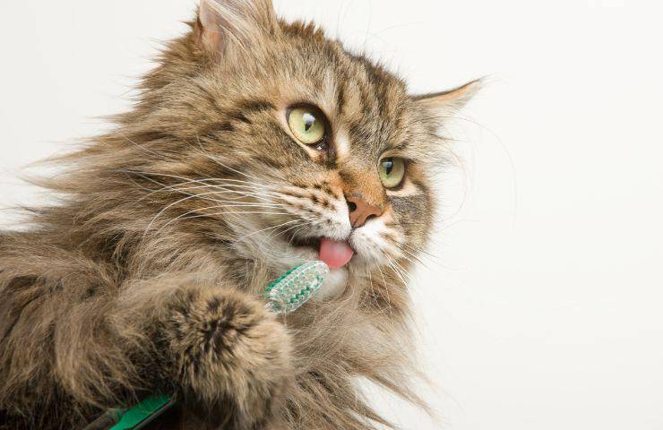 Potremmo abituarlo gradualmente al ‘sopportare’ il nostro dito, ricoperto di garza sterile e dentifricio per gatti, che passa con movimenti circolari sui suoi denti (iniziamo con due alla volta e aumentiamo giorno per giorno).