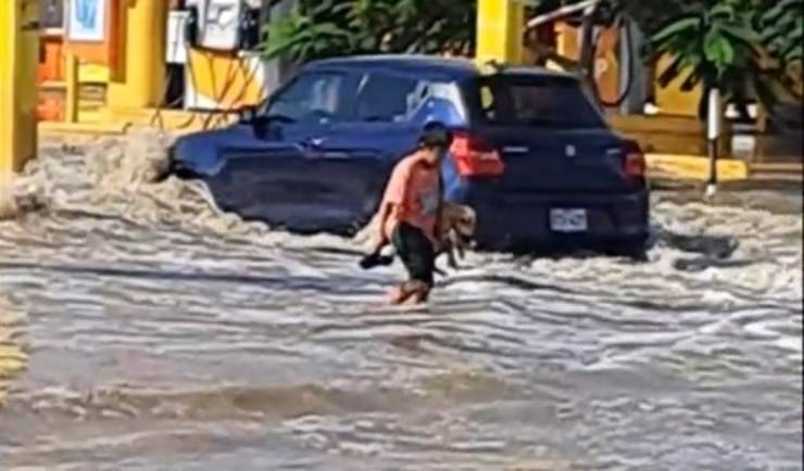 Come si vede nel video diventato virale sui social network, il ragazzo salva il cane che era salito su una piccola piattaforma per sfuggire all’inondazione. Non gli importa che l’acqua sia sopra le sue ginocchia, prende semplicemente il cane tra le mani e lo porta in un luogo sicuro. Oltre all’acqua che ricopriva la strada, il giovane ha dovuto fare i conti con le onde causate dai veicoli che circolavano intorno a lui, che peraltro non si sono fermati ad aiutarlo in nessun momento. Così è dovuto andare a piedi nudi (tiene le scarpe da ginnastica in mano) e camminare lungo la strada allagata per portare in salvo se stesso e il suo cane.