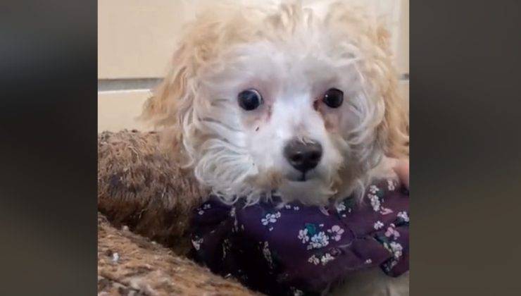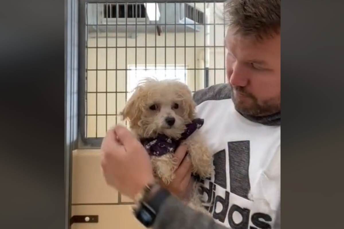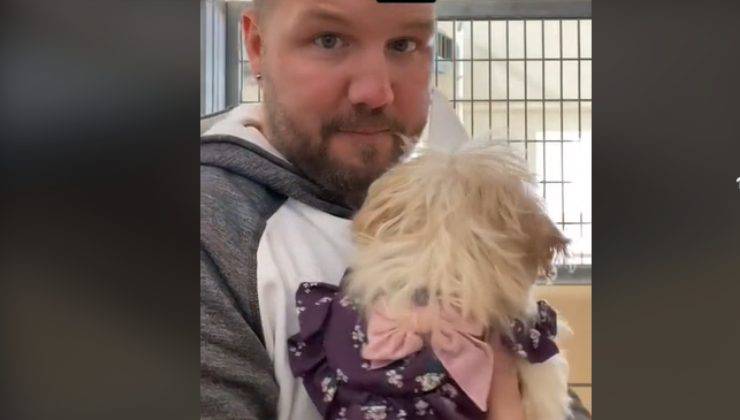 Il filmato è stato condiviso su TikTok nei giorni scorsi e ha ottenuto nel giro di poco tempo migliaia di visualizzazioni. Le immagini testimoniano lo sguardo deluso della cagnolina che, con il suo cappottino viola puntellato di fiorellini bianchi, si trova in braccio al responsabile del rifugio.