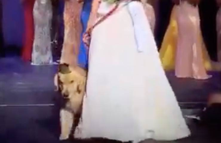 Il momento in cui tutti i riflettori della serata si sono improvvisamente concentrati sulla presenza del quattro zampe è stato immortalato dalle telecamere presenti all’evento e poi condiviso in rete tramite la pagina ufficiale Facebook – ad esso dedicata – di “Pageant Update – Miss USA Coverage“.