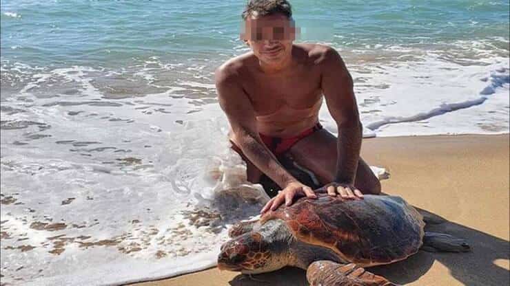 Una tartaruga in difficoltà era intrappolata in una busta di plastica e rischiava di annegare. Senza prestare attenzione al mare agitato, l’uomo si getta in mare per soccorrere l’animale di 30kg.