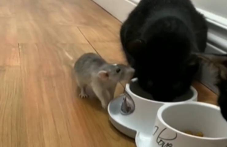 Mentre il topino si serve da solo la sua porzione di cibo, i gattini continuano tranquilli a mangiare dalle loro ciotole, senza rimanere affatto sorpresi dal comportamento del roditore e senza cercare di allontanarlo. Forse allo stesso modo del film Disney del quale sembrano rievocare la scena, anche questi due gattini dal manto nero e il piccolo topolino condivideranno una grande amicizia, testimoniata proprio dal modo in cui condividono i loro pasti. (di Elisabetta Guglielmi)