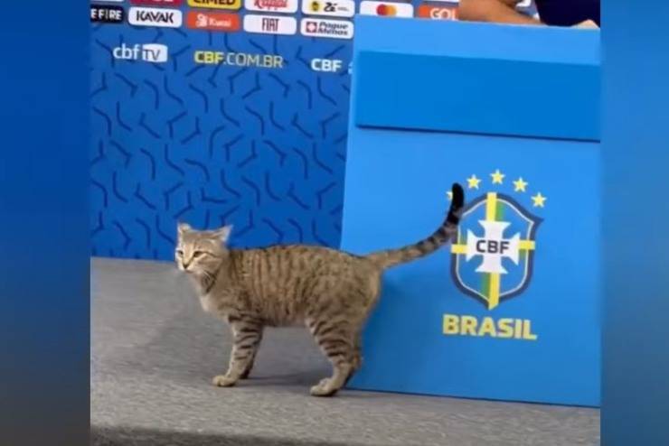 Nell’attesa del fischio di inizio del match tra Brasile e Croazia si stava svolgendo, come consueto, una conferenza stampa. In quel momento appariva ai microfoni il giocatore Vinicius Jr. impegnato a rispondere alle domande dei giornalisti. Insieme all’attaccante della nazionale brasiliana è comparso sul tavolo un gatto che aveva trovato quel posto adatto a lui e aveva così deciso di sostarvici.