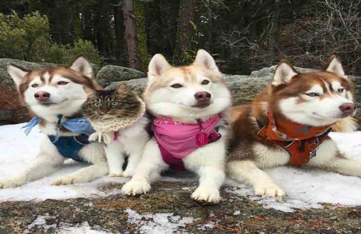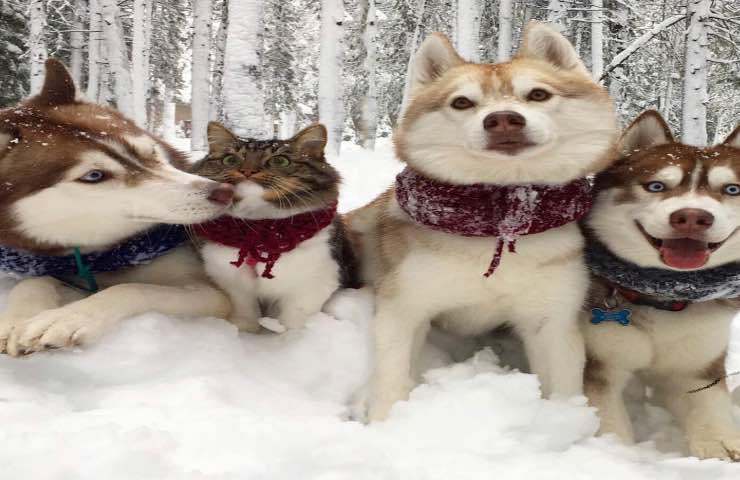 I tre Husky sono un branco di tre sorelle femmine, che hanno incontrato casualmente la gattina e se ne sono occupate. La storia inoltre è spopolato sul web infatti le tre sorelle hanno una pagina che ad oggi vanta più di 400.000 followers.