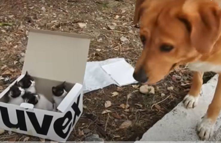 Alcuni gattini sono stati abbandonati in una scatola rischiando la morte: l’intervento di un dolcissimo cane ha salvato loro la vita.