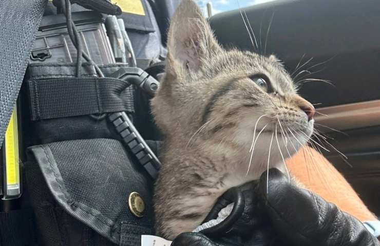 Pochi minuti dopo, mentre lo stesso agente stava parlando con il conducente del furgone, vede sbucare un gattino dall’erba dove aveva sentito in precedenza i rumori, poi il piccolo felino si mette seduto comodo sui piedi dell’agente. Il dolce fatto improvviso ha salvato l’automobilista con una semplice ammonizione, per poi rivolgere tutte le sue attenzioni al salvataggio del piccolo gattino.