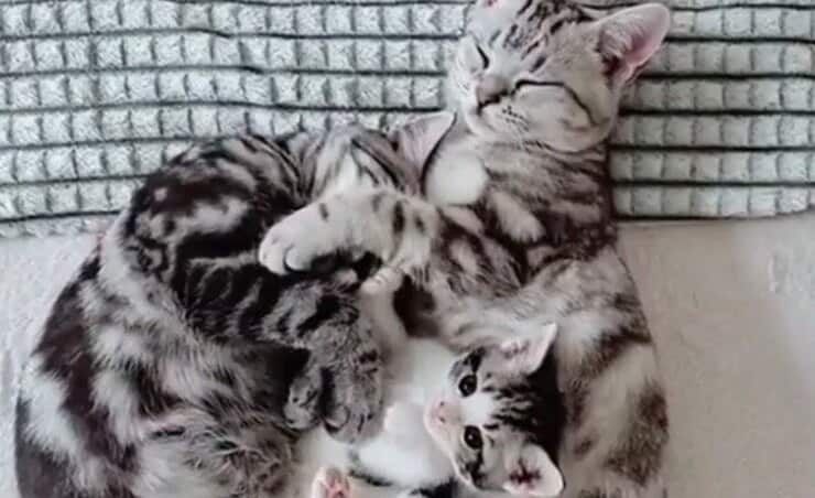 Proprio come questo gattino che non ha proprio sonno, continuando a girarsi e rigirarsi tra i genitori che invece dormono in modo pacato. Nonostante il suo continuo muoversi, la coppia non sembra infastidita, anzi restando fermi proteggendolo, lo lasciano fare.