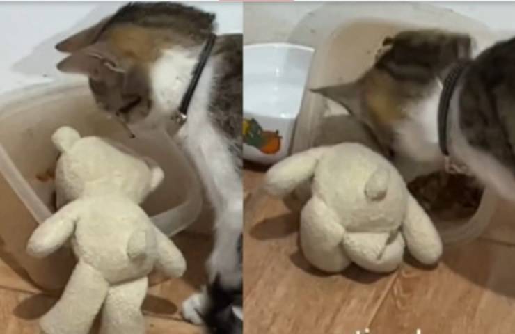 Il video mostra, infatti, il momento in cui il micetto prende il suo orsacchiotto di peluche e lo porta alla ciotola in modo da farlo mangiare insieme a lui. Come si legge nella didascalia, all’inizio il suo padrone pensava che il gattino stesse giocando con l’orsetto. In realtà, come si vede dalla scena successiva, il felino stava solo cercando di prendere il peluche per spostarlo.