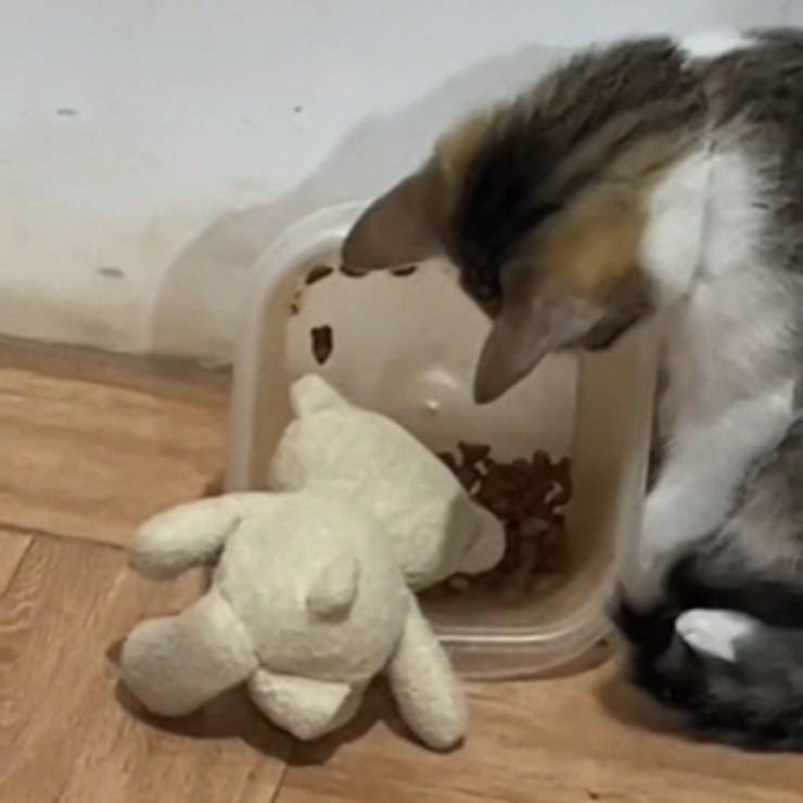 Il video del tenero e premuroso gattino che si prende cura del suo orsacchiotto di peluche e lo porta alla ciotola per farlo mangiare.
