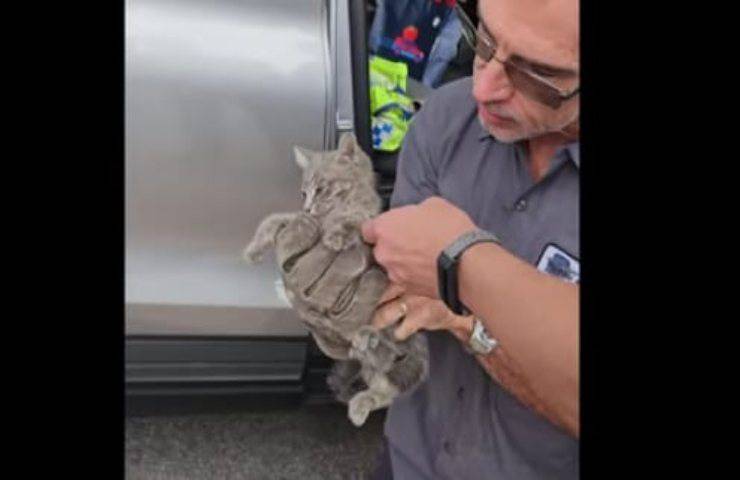 Mostrando la compassione e la gentilezza, non solo degli agenti ma anche delle persone che notando il gattino hanno contattato le autorità per far si che venisse messo in salvo.