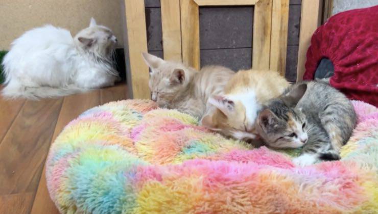 Se è vero che il comportamento dei gatti adulti è diverso dai cuccioli, è altrettanto vero che i gattini – una volta raggiunta la loro nuova casa provvisoria – hanno presto istaurato un bellissimo feeling con la gatta Ruby. L’adulto felino dal manto bianco ha accolto i micetti come se fossero i suoi cuccioli divenendo ben presto la loro mamma adottiva.