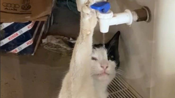 Il video è stato caricato da @thtbeluuparrado, ne quale si vede il gatto su due zampe e che usa una di quelle anteriori per tirare su la leva che fa cadere l’acqua direttamente nella sua bocca. Il gatto si lecca le zampe per bere, il che inevitabilmente fa cadere gran parte dell’acqua su di lui e direttamente sul pavimento.