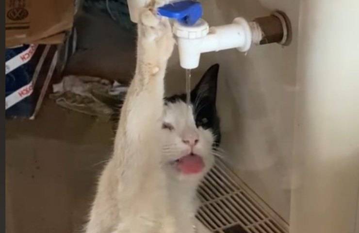 Al gatto piace l’acqua fresca e quindi la beve direttamente dal rubinetto, il fatto viene ripreso e pubblicato sui social network – VIDEO.