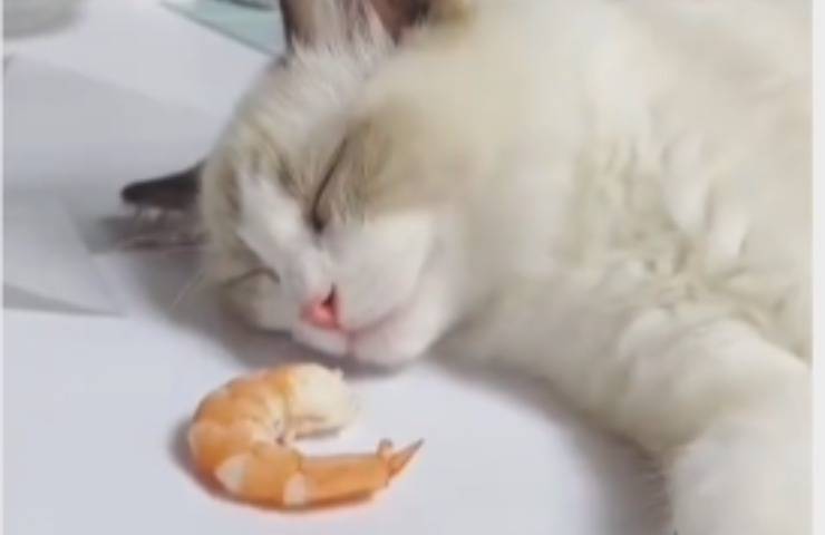 Gatto sogna un gamberetto e al risveglio lo può mangiare veramente: che sorpresa