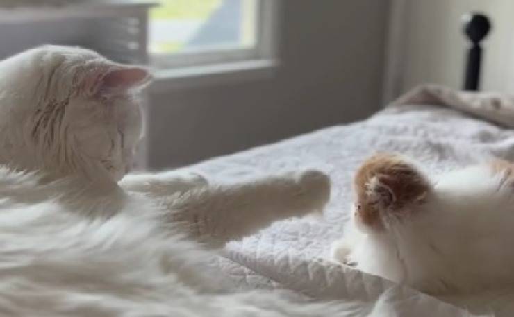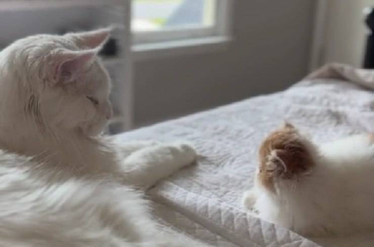 Quando si ha un animale domestico in famiglia è tutto più impegnativo, ma anche più bello. Il problema potrebbe presentarsi eventualmente al momento di introdurne un altro nel nucleo familiare. Quello che c’è da tanto tempo potrebbe non prendere bene la presenza del nuovo arrivato. C’è un video su Tik Tok che ha colpito milioni di utenti in cui un gigantesco Maine Coon incontra il piccolo gatto Persiano appena adottato dalla famiglia. Come andrà il loro primo contatto? Sono immagini tutte da vedere e da gustare.