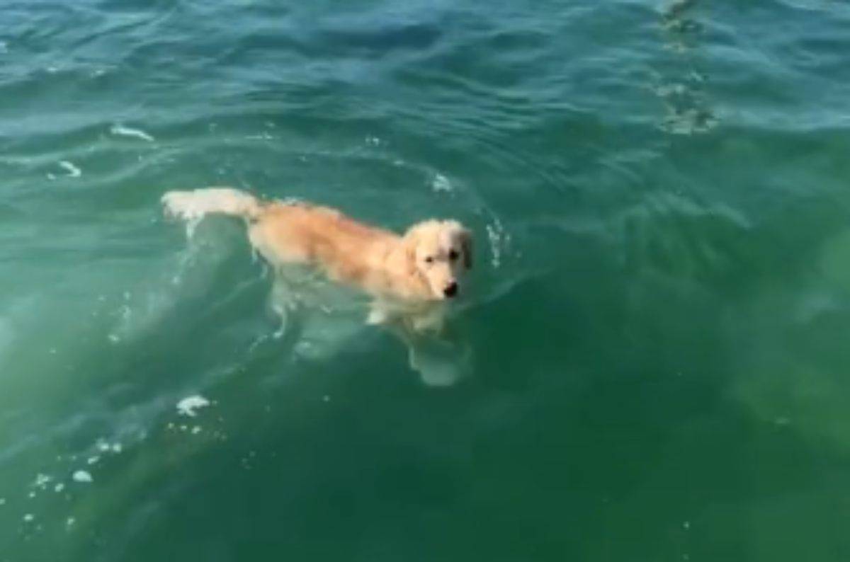 La voce nel video racconta che non è la prima volta che vedono i delfini nel canale, ma era la prima volta che il simpatico Golden tentava di approcciarne uno e in modo così veloce! La didascalia condivisa sotto il video recita: “Mai visto un cane nuotare così velocemente“.