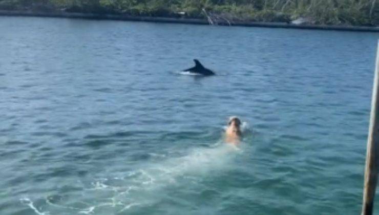 Per spiegare cosa sta succedendo, una voce spiega che la famiglia vive alle Bahamas e che in quella giornata un delfino molto curioso è entrato nel canale adiacente alla proprietà. Il Golden Retriever, quindi, non ha perso tempo ha cercare di stringere amicizia con il nuovo arrivato e sorprende l’irruenza con l’ha fatto.