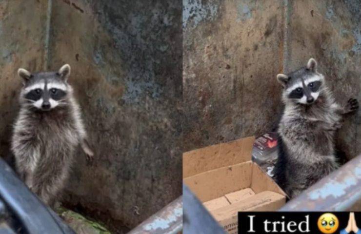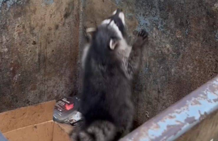 La richiesta di aiuto da parte di un procione intrappolato in un cassonetto dei rifiuti (VIDEO)